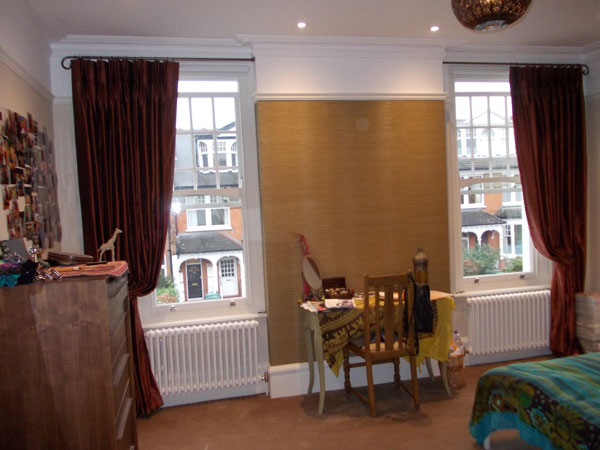 Side opening eyelet curtains in dramatic deep red coloured linen fabric.