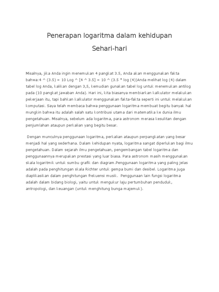 Contoh tingkat kebisingan jalan di luar aula konser di pusat kota jakarta diukur sekitar 7 bel. Perhitungan bunga bank, laju pertumbuhan bakteri dan dapat juga untuk menentukan umur. Sistem persamaan linear tiga variabel. Logaritma merupakan kebalikan dari perpangkatan atau eksponensial. Tetapi, sebelum mempelajari logaritma, apakah kamu tahu apa itu logaritma dan bagaimana.